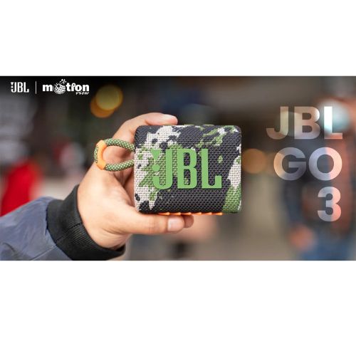 The JBL Go 3 features a modern, eye-catching design with expressive details and a fabric-wrapped exterior that gives it a premium feel. Its ultra-portable shape fits perfectly in your palm, backpack, or pocket. With a vibrant range of colors, you can choose a style that matches your personality — bold, sleek, or playful.