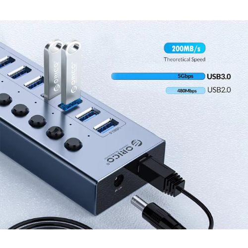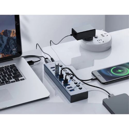 Unlike standard hubs, the Orico BT2U3-16AB features dedicated switches for each port. This allows you to turn specific ports on or off without unplugging devices, reducing wear and improving convenience. The LED indicator lights make it easy to see which ports are active.