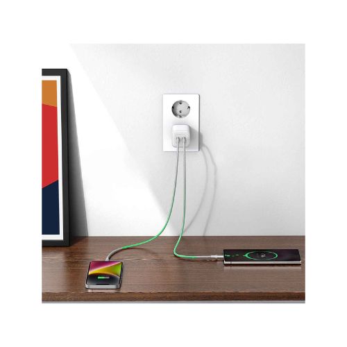 The charger features two USB-C ports, making it possible to charge two devices simultaneously.