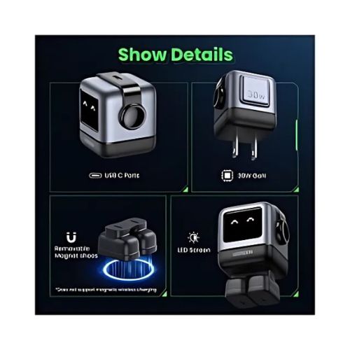 | Others | Robot GaN Charger: The ideal charging accessory that combines functionality and playful, Powerful 30W Charging: For your iPhone 14 Pro Max from 0 to 55% in just 30mins, LED Display: Different expressions correspond to different charging states, Multiple Safety System: Built in short circuit protection, overload protection, over temperature protection, and overvoltage protection are ready for all round security |