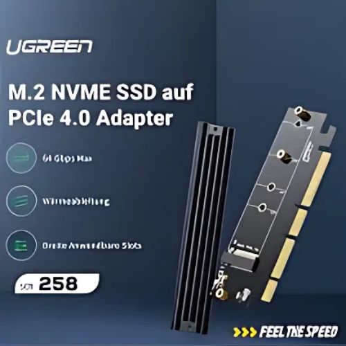 | Feature | High performance Ugreen 30715 PCIe NVMe transfer card: Integrated PCIe 4.0 (16X physical size - 4X bandwidth) - the transfer speed of this PCIe M.2 Adapter is up to 64Gbps and backward compatible with PCIe 3.0 / 2.0 / 1.0. Wide compatibility PCIe SSD Card: Compatible with PCIe X16/X8/X4 slot and size 2280/2260/2242/2230 M-Key and M&B-Key NVMe/AHCI SSD. Note: This PCIe NVMe adapter does not support SATA/NGFF SSDs. Ugreen 30715 features safe and stable heatsink designed for better heat dissipation - comes with 2 silicone pads to enhance SSD heat dissipation. Built with short circuit - over current - over voltage - EMI protection and multiple protections to ensure the safety of your SSD and valuable data |