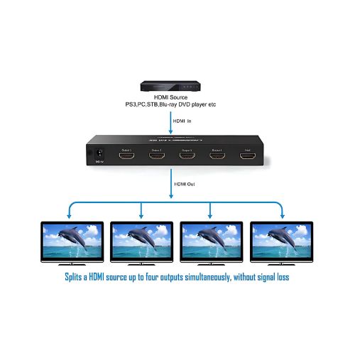 Connect one HDMI source and output it to four different displays at once — ideal for multi-screen gaming, sports bars, trade shows, and digital signage.