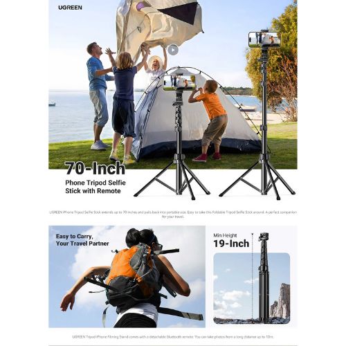 | Specialty | Portable, Slip Resistant, Remote Control, UGREEN mobile phone tripod has adjustable height, extending from 19 inches to a maximum of 67 inches, ideal for live streaming, video recording and photography, Ugreen 15609 is a selfie stick with this phone tripod can be used as an extra long selfie stick, suitable for taking photos with friends and family. Just unscrew the bottom screw and the tripod shaft, you can pull out the stick directly and take a real selfie, say goodbye to the heavy base when taking photos |