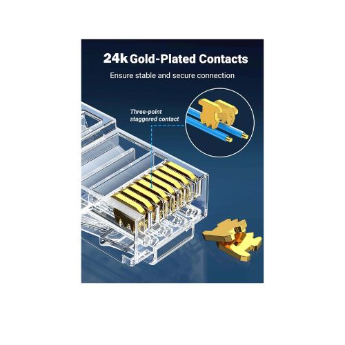 Each RJ45 plug features 24K gold-plated contacts that ensure stable signal transmission, reduce crosstalk, and minimize data loss — ensuring a clear and consistent network performance.