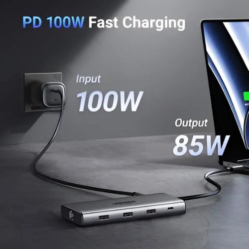 The dedicated USB-C PD charging port supports up to 100W power delivery, keeping your laptop fully charged while simultaneously running multiple connected devices. This eliminates the need for carrying extra chargers.