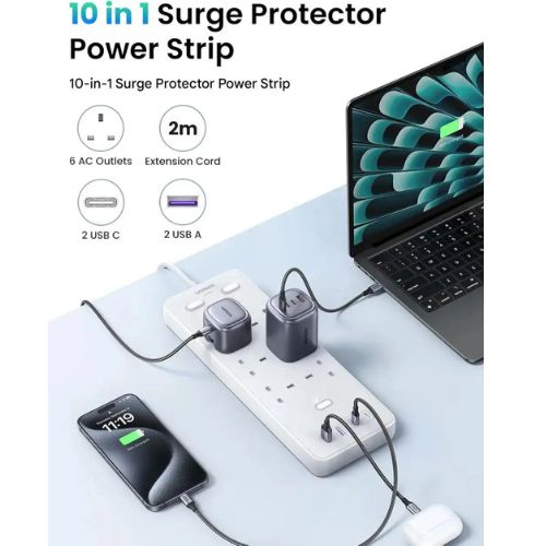 The UGREEN S551 (35011) 65W 6-Outlet Surge Protector Power Strip is not just a basic power strip—it’s a smart power management solution. Equipped with 6 AC outlets, 3 USB-A ports, and 1 USB-C PD port supporting up to 65W Power Delivery, this surge protector is built to handle multiple devices simultaneously while protecting them from power surges and voltage fluctuations