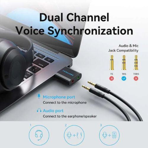 The Vention VAB-S17-B USB External Sound Card is more than just an accessory — it is a cost-effective solution for upgrading your computer’s audio system. If your headphone or microphone jack is damaged, this adapter offers a quick and reliable fix. Its dual-port design allows simultaneous connection of headphones and microphones, which is perfect for remote work, online classes, and streaming